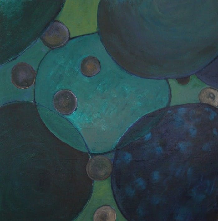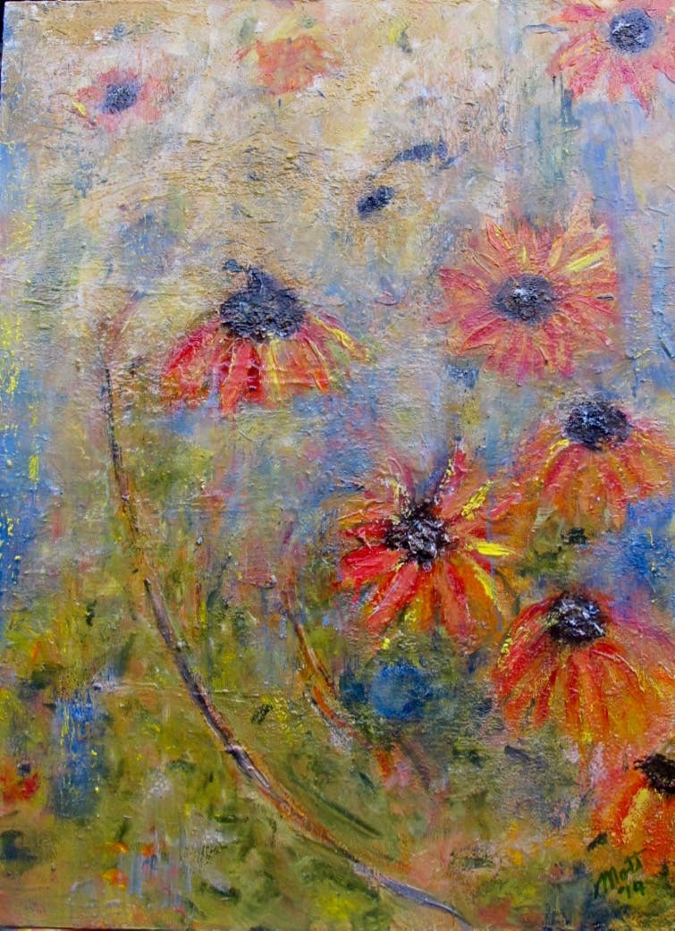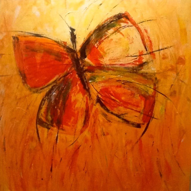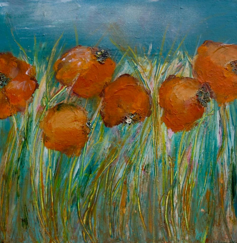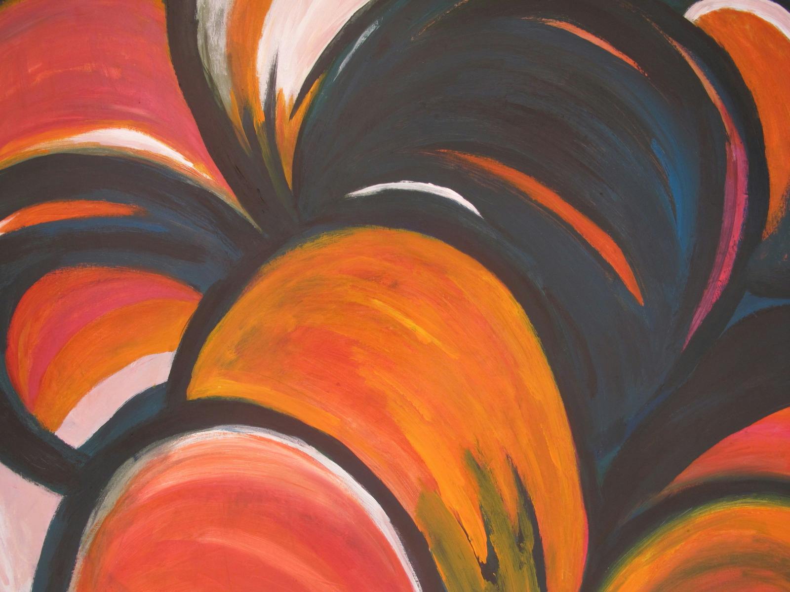The colors of sunrise and sunset are the most inspiring for Joy as she loves vibrant colors which she incorporates in her impasse, abstract paintings on (mostly) large canvases.